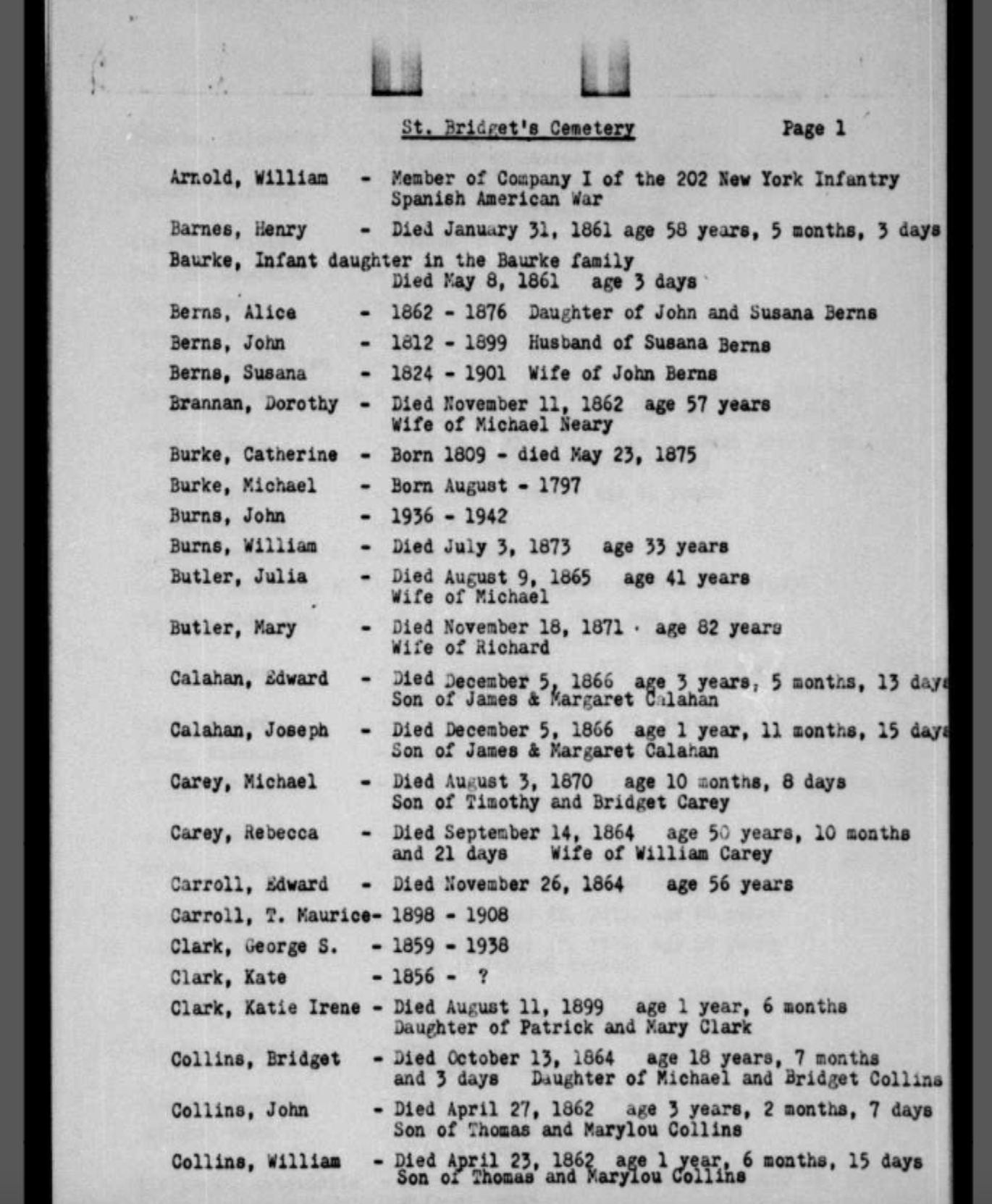 Within the church records that were digitized on FamilySearch.org, there is (what appears to be) a tombstone reading for St. Bridget Cemetery in Newfane. The listing of those buried are in alphabetical order and is typed.