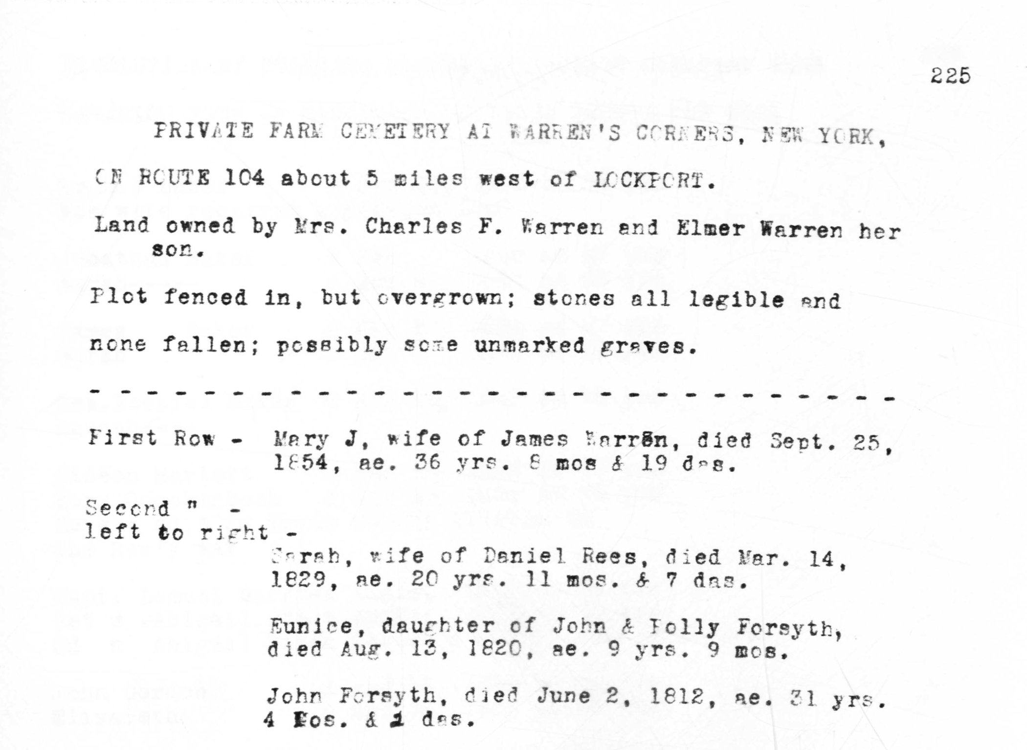 The DAR conducted a tombstone reading at Warren’s Corners Cemetery in 1938. It was published in Volume 116 of the Genealogical Records Committee Reports. Below is a scan of the tombstone reading obtained from the New York State Library.